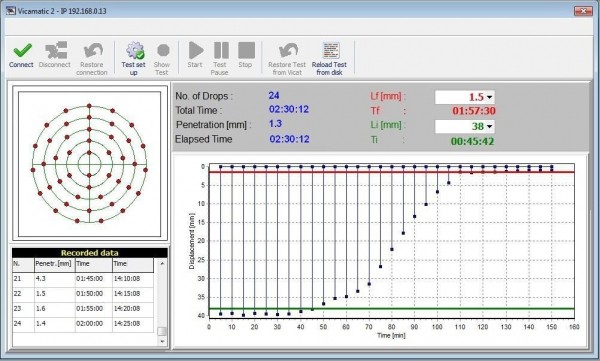 Možno nastavit : Spoždění začátku testu, pozice penetračních bodů, intervaly zkoušek, automatickou detekci konce zkoušky, automatické měření počátku a konce tuhnutí